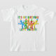 Camiseta divertida y colorida con imagen de figuras bailadoras, y texto de "¡Es mi cumpleaños, vamos a participar!".