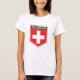 La bandera nacional de Suiza está infundida en una forma de escudo que también tiene el nombre del país puesto encima de la bandera.