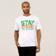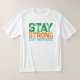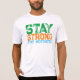 Una camiseta con el eslogan motivador "Mantente fuerte motivado" en una tipografía de texto negrita verde, naranja y azul angustiado.