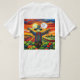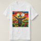 Un espantapájaros brillante y colorido se encuentra en un campo vibrante lleno de plantas exuberantes y patrones surrealistas bajo un cielo ondulado y colorido, feliz de haber encontrado empleo.