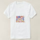 El diseño de la camiseta muestra la frase "Esperanza desencadena revoluciones" en un audaz tipo de letra de graffiti. Las letras están salpicadas de colores vibrantes y contrastantes, creando un efecto dinámico y enérgico. El diseño general transmite un mensaje de optimismo y cambio social.
