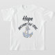 Esta camiseta del chica muestra un único tipo de letra de huellas de huesos negros con letras negras, un contorno azul claro más una cita de la biblia que muestra las palabras "Hope Anchors The Soul" con un icono de ancla azul claro con una cuerda debajo de este tema de citas basado en la biblia. Esta camiseta presenta un ajuste relajado para la forma hembra hecha de 100% algodón esta camisa es duradera y suave que hacen una gran combinación.