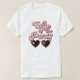 Camiseta divertida y adorable de la fiesta de la soltera para la novia con "Esposa del Fiesta" en un gran guión estilo retro rosa de los años 70 y gafas de sol en forma de corazón. Una camiseta "La vida del Fiesta" está disponible para el equipo de bachillerato.