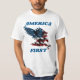 Este diseño presenta las palabras "AMERICA FIRST" con las letras azules y un águila coloreada en las estrellas y las rayas.