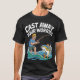 Esta camiseta negra muestra el ilustracion personalizado de un hombre que usa un gorra amarillo, una camisa azul y pantalones cortos verdes, pescando con entusiasmo. Está parado en aguas azules y verdes, tambaleándose en un gran pez que salta del agua con un salpicón. Encima del ilustracion, el texto "CAST AWAY" está escrito en una letra grande y curvada en blanco, y debajo, "SU PREOCUPACIÓN" se muestra en un estilo similar. Este diseño transmite un mensaje claro sobre los beneficios de la pesca para aliviar el estrés.