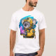 Camiseta de arte de dibujos animados de koala buzo de aguas profundas. Traje de buzo vintage y una medusa brillante sobre un fondo cian brillante. Estilo caprichoso de cómic para aventureros.