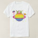 Dos extranjeros lindos que se colocan en un planeta en espacio exterior, con una nave espacial y las estrellas rodeándolas.