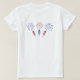 Feliz 4 de julio tipografía y petardos en camiseta con el texto "Feliz 4 de julio" y estrellas en el frente y petardos y fuegos artificiales en la espalda.