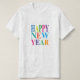 Celebra el Año Nuevo con tu familia y amigos con esta colorida y linda camiseta, que muestra un texto grande que dice "feliz año nuevo" con letras en azul, naranja, verde, amarillo, fucsia, agua y color púrpura.