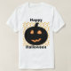 Una calabaza festiva, sonriente, Happy Halloween se sienta sobre un patrón de diseño digital personalizado de formas abstractas de molinillo.