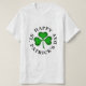 Una camiseta con un diseño de trébol de shamrock verde y un "HAPPY ST" negro. Texto del "DÍA DE PATRICK" a su alrededor.
