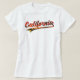 Camiseta blanca de California para mujeres con puesta de sol y palmeras. Este diseño presenta la palabra "California" en una fuente con cola de trazo libre con colores de puesta de sol y palmeras. Te encantará esta camiseta de California para hombres si te gustan las puestas de sol de California.