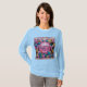 Camiseta de Fiesta de globos de manga larga azul claro para mujeres Esta es una camiseta de Fiesta de globos de manga larga Fiesta. La camiseta es una camiseta básica de manga larga para mujeres. El color de la camiseta es Azul claro. El diseño se ha diseñado con arte generativo. El arte incluye globos estrella de color rosa, azul y amarillo con un gran globo rosa en el centro. Fiesta también se escribe con globos rosados en medio de la imagen. Puede cambiar la imagen con el botón Personalizar. La imagen y el Fiesta están en la parte delantera y trasera de la camiseta.
