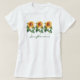 Fila de la camiseta de encargo de la palabra de la flor amarilla del jardín de los girasoles. Guarde, cambie o suprima la fraseología. Amarillo de las características 3 y girasoles del jardín del oro en una fila, cada uno en un tronco con una floración grande y hojas. La fraseología opcional tiene girasoles en una escritura de la diversión debajo. Una primavera de la diversión o un diseño del verano. Nota: Este diseño imprimirá solamente bien en las camisetas BLANCAS.
