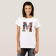 This initial 'M' is special for its rustic blend of patriotism and natural beauty. The bold letter form is filled with a cracked, vintage American flag pattern, symbolizing classic, weathered Americana. It is richly adorned with a layered display of vibrant red roses, white daisies, and patriotic red hearts. This highly detailed graphic is ideal for personalized patriotic apparel, family name initials, or vintage folk art prints.