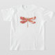 Dibujado artísticamente, dorado, libélula con joyas de color rojo y alas decoradas con rojo, floreciente, cerezo japonés con joyas sobre fondo blanco. Dragonfly de oro.