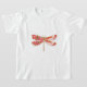 Dibujado artísticamente, dorado, libélula con joyas de color rojo y alas decoradas con rojo, floreciente, cerezo japonés con joyas sobre fondo blanco. Dragonfly de oro.