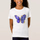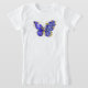 Joyería, azul, zafiro, mariposa floral brillante con ala decorada con flores azules y preciosas con hojas de oro sobre fondo blanco.