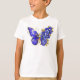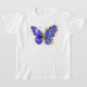 Joyería, azul, zafiro, mariposa floral brillante con ala decorada con flores azules y preciosas con hojas de oro sobre fondo blanco.