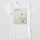 : La camiseta presenta un diseño sencillo y elegante con un gráfico floral. El gráfico consiste en una flor estilizada con dos flores, una más grande que la otra, conectadas por un tallo verde delgado con hojas. La paleta de colores es suave, con tonos pastel de naranja, negro y verde. Encima de la flor, la palabra "Flor" está escrita en escritura cursiva con un matiz azul que añade a la delicada estética del diseño. El fondo es blanco y sobrio, lo que acentúa el minimalismo y la sofisticación de la imagen.