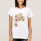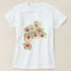 Esta bonita camiseta decorativa presenta un delicado patrón de flores amarillas pálidas, casi blancas, con centros de color rosa oscuro. Forman una composición artística, abstracta de círculos y estrellas.