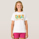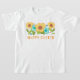 Una linda camiseta con un parche floral amarillo y azul con el texto 'Feliz Pascua'