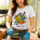 Si te gusta la jardinería, te encantará esta camiseta. Esta camiseta blanca cuenta con estaciones de posteo con flores violetas de la Viola, latas de agua y otras necesidades del jardín. Añadí un overlay de un pájaro y una mariposa y siento que hacen este diseño perfecto. Compra este té blanco de verano para ti mismo o como regalo a otro jardinero.