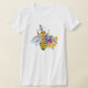 Artistically drawn, flower, honey bee with contrasting colors, yellow, bright, blooming california poppy and blue wild plants on white background.