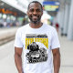Set against a crisp white background, this design takes on a refined, archival quality. The stark contrast highlights the intricate line work of the locomotive illustration, emphasizing the mechanical details of the boiler, driving wheels, and iconic smoke box. This clean aesthetic is ideal for modern interiors or minimalist gift collections, giving the vintage subject a fresh and timeless appeal. The bold yellow typography provides a vibrant pop of color that stands out sharply, making the legendary name as much a focal point as the engine itself.