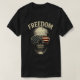 Skull with aviator sunglasses reflecting stars and stripes, edgy distressed design, bold freedom-themed typography, black background