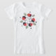 Cute fresas chica tee con un ilustracion vectorial que representa a 5 felices personajes sonrientes de fresa bailando en un círculo rodeado de hojas y flores de su propia especie. Diseño divertido con espíritu primaveral para una persona que ama estos deliciosos frutos.