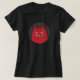 gótico de Guay tee con un ilustracion personalizado de un monstruo malvado gracioso con dientes afilados y pelos saliendo de sus orejas sonriendo, en rojo y gris. Este maligno tee monstruo atraerá a alguien a quien le gustan los personajes malvados, personalizados y estilo gótico.