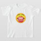 © Sunny Mars Designs. Camisetas de Emoji facial ríe - Estos tés geniales, humorísticos, divertidos, presentan un ilustracion divertido de una emoji emoticono facial amarilla con una boca abierta, dientes de perlas blancas brillantes, lengua y ojos cerrados. Concepto de humor.