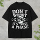 This witty design features the phases of the moon, paired with the phrase “Don’t Worry, It’s Just a Phase.” The distressed texture and vintage style give this shirt a timeless, cosmic vibe.