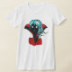 Camisa de vampiro con un ilustracion digital de un divertido personaje chica de piel oscura sin muerte con ojos brillantes, pelo azul, fanáticos y una capa roja vibrante.