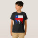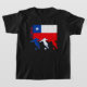 Juego de tres jugadores de fútbol delante de la bandera chilena. El nombre de país Chile está en el lado