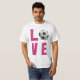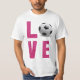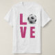 El diseño de las palabras de Love Soccer con letras brillantes de color rosa intenso y el "o" es reemplazado por una pelota de fútbol.