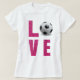 El diseño de las palabras de Love Soccer con letras brillantes de color rosa intenso y el "o" es reemplazado por una pelota de fútbol.