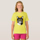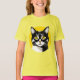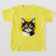 Una ilustración vibrante de un gato blanco y negro con ojos amarillos penetrantes, colocada sobre un fondo circular amarillo audaz. La obra de arte detallada captura vívidamente la expresión curiosa y vigilante del gato.