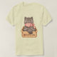 Gato gris esponjoso sentado cómodamente dentro de una caja de cartón. El texto "Si cabe, se sienta" expresa la regla de comportamiento innata del gato.