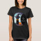 Un lindo gato negro con el gorra de una bruja y una corbata de arco naranja es "¡Demasiado lindo para ser aterrador!"