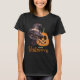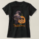 Camiseta feliz de Halloween con un lindo gato negro en gorra de brujas y una sonriente calabaza tallada con texto personalizado y personalizado.
