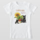 Camiseta con temática de granja con texto de mano de labranza y lugar para su nombre. La linda imagen está hecha de un gato negro y un gatito sentados al lado de una olla llena de verduras de raíz recién recolectadas. Al fondo hay un gran girasol alegre. El texto "Farmhand" está en la parte superior en morado con sombra amarilla. Su nombre está escrito.