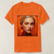 A girl with blue eyes on an orange background, dark black and crimson, photorealistic fantasies, personal iconography, detailed character design, shiny/glossy