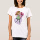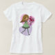 Cute mini art of a whimsical girl with long flowing yellow hair and wearing a green dress and striped stockings. She is holding a beautiful bunch of red roses in her outstretched hands. Originally made as digital art, to add some joy to your wardrobe.