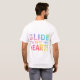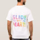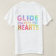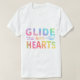 La camiseta muestra el mensaje "Glide to Hearts" en una cascada de colores vibrantes. Cada carta brilla con un matiz diferente, creando un diseño lúdico y llamativo. El efecto general es de calidez y accesibilidad, perfecto para alguien que quiere dar una impresión positiva.