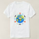 Carácter rodeado por símbolos cristianos - símbolo del globo del mundo del dibujo animado de la cruz, de la Sagrada Biblia, de la paloma y de los pescados.