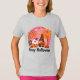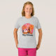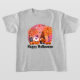 Camiseta de Halloween con un gnomo, fantasma, calabazas y árboles caídos con una luna rosa en el fondo. El texto de la camiseta es personalizable.