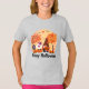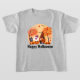 Camiseta de Halloween con un gnomo, fantasma, calabazas y árboles caídos con una luna amarilla en el fondo. El texto de la camiseta es personalizable.