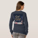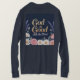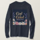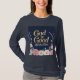 This t-shirt features God is Good in gold script lettering with All the Time below it in silver script letters. There is a floral arrangement around the text with white daisies with yellow centers, pink roses and purple lavender sprigs. The color palette consists of navy blue, gold, silver, white, pink and purple, creating a sophisticated and spiritual aesthetic. The t-shirt is a women's basic long sleeve t-shirt. The color of the t-shirt shown is a navy blue color.